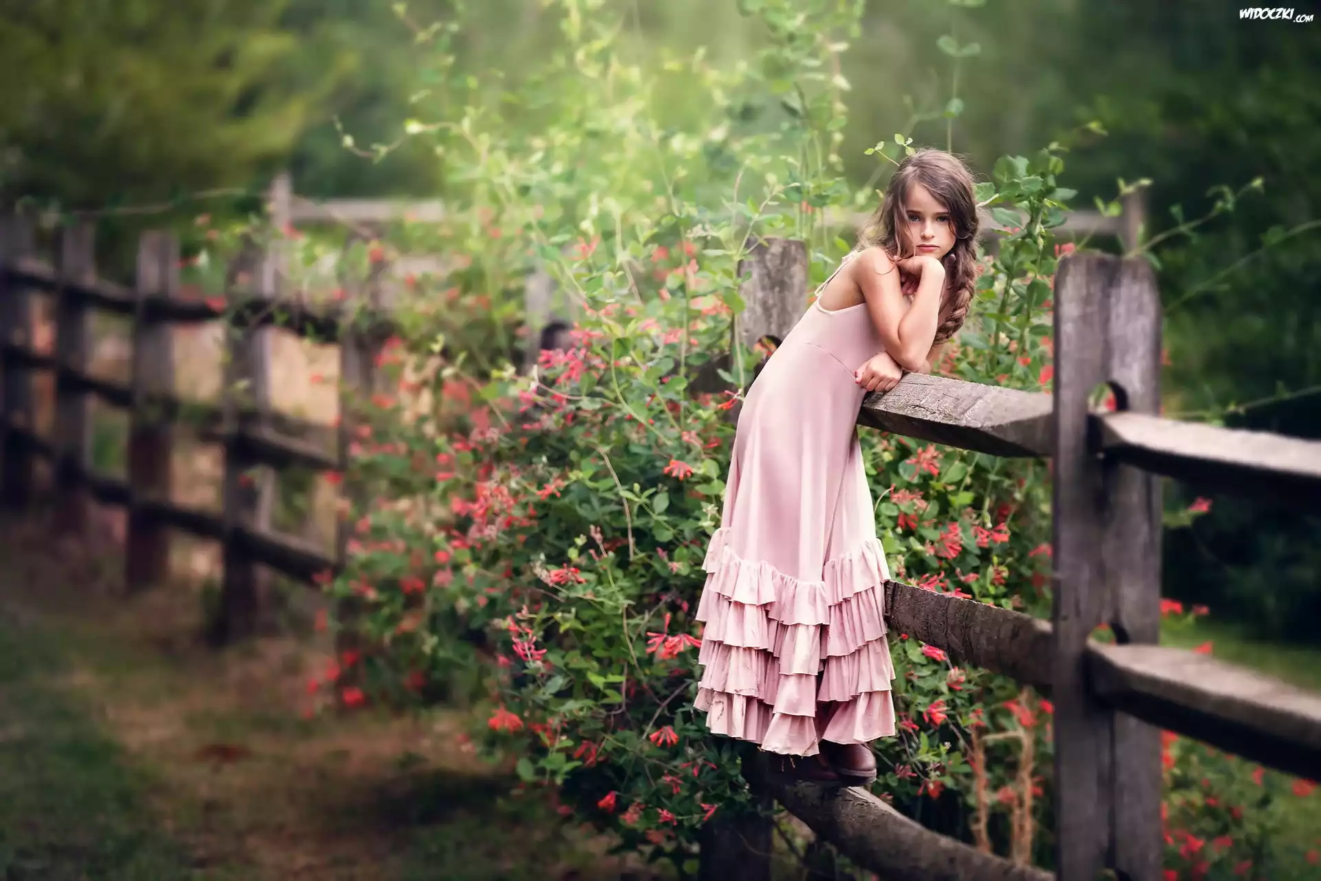Zdjęcia, Dziewczynka, Różowa, Sukienka, Ogródek, Ścieżka, Płot, Ogrodzenie, Pelargonie