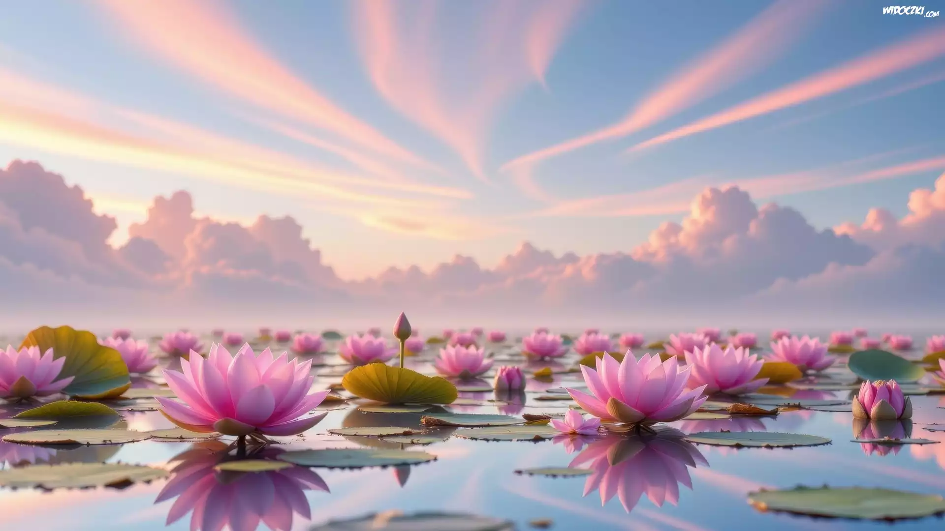 Zdjęcia, Kolorowe, Niebo, Chmury, Różowe, Kwiaty, Lilie wodne