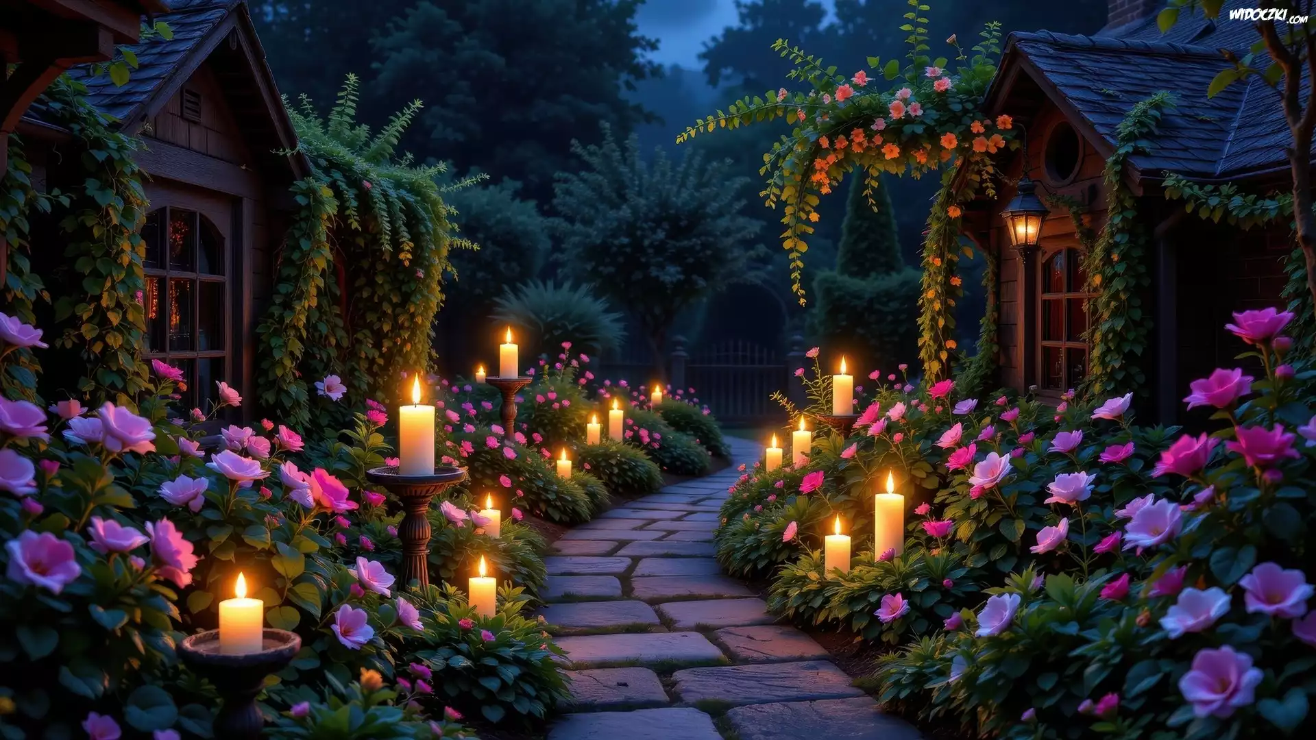Zdjęcia, Ogród, Dwa, Domy, Różowe, Kwiaty, Świece, AI