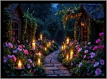 Ogród, Dwa, Domy, Różowe, Kwiaty, Świece, AI