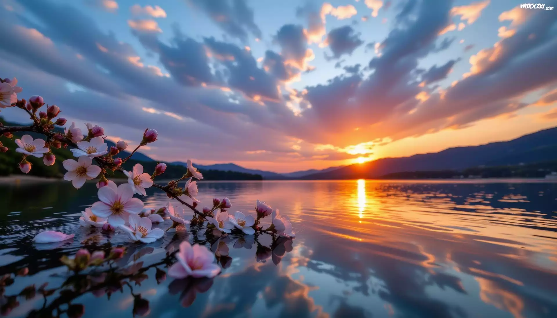 Różowe, Kwiaty, Gałąź, Jezioro, Niebo, Zachód słońca, Grafika AI