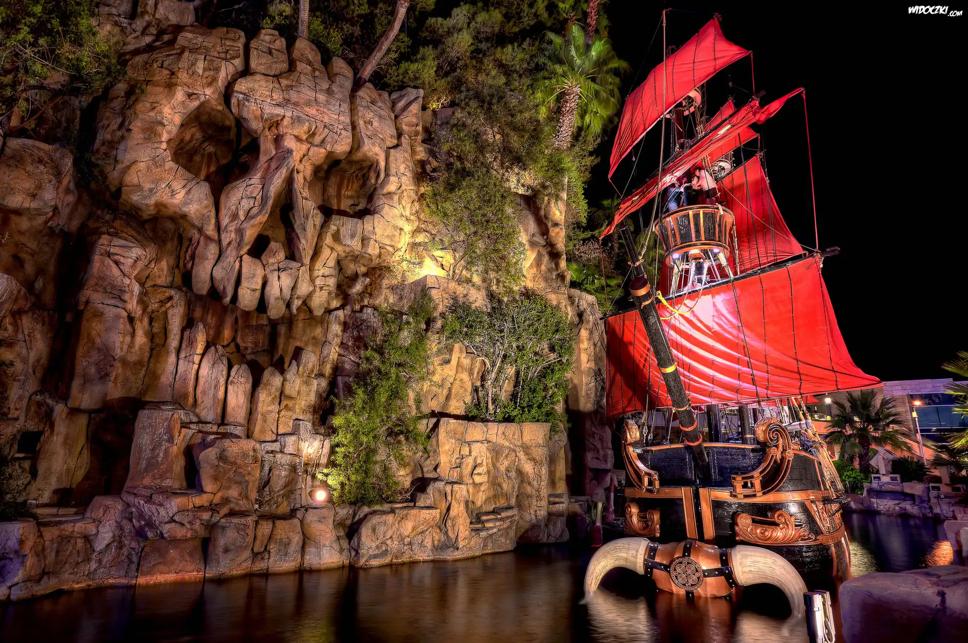Zdjęcia, Park rozrywki, Statek piracki, Czerwone, Żagle, Skała, Czaszka