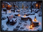 Zdjęcia, Zima, Noc, Domy, Śnieg, Alejka, Ławki, Rozświetlone, Lampiony, Drzewa, Oświetlona, Choinka