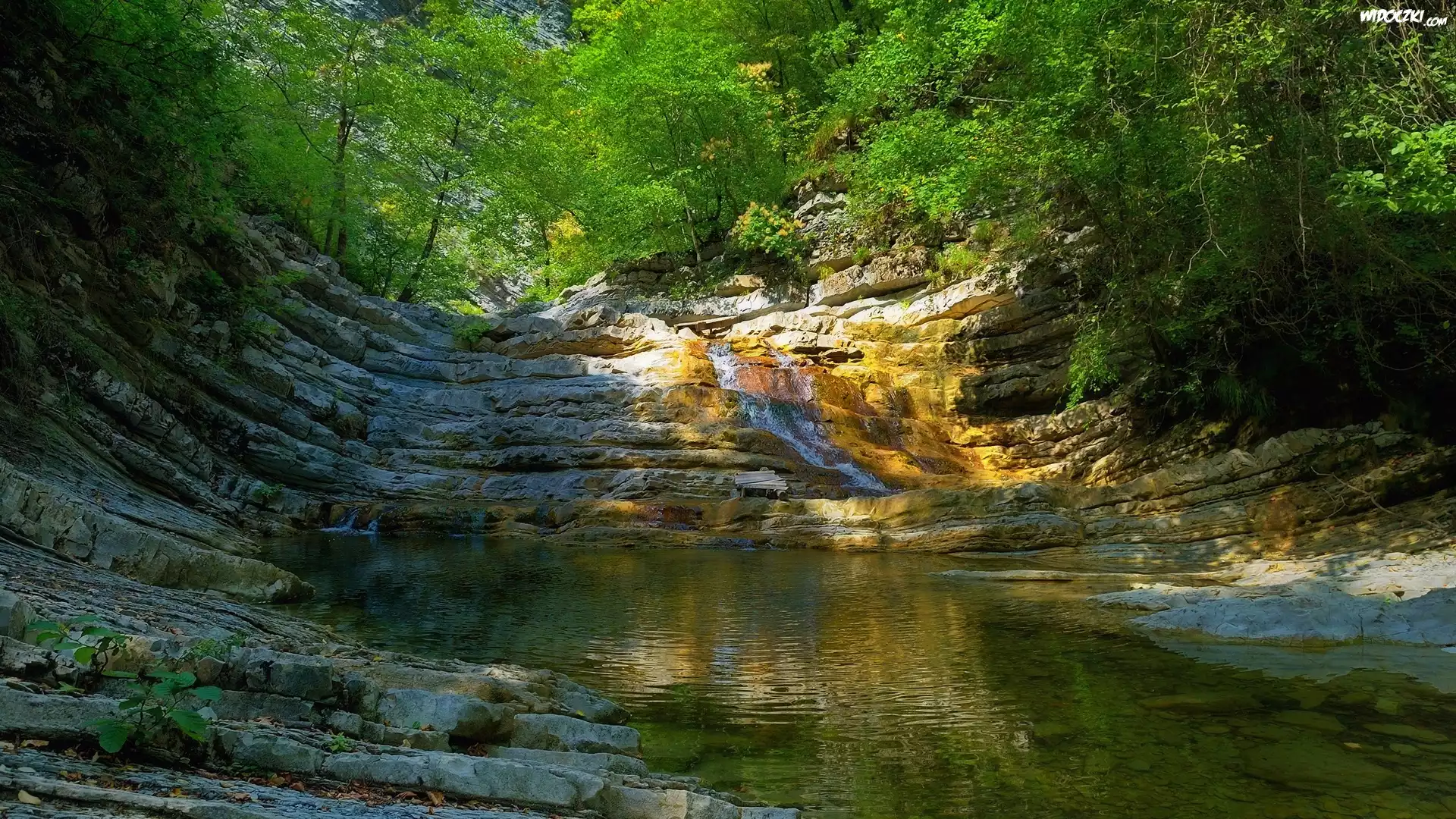 Rozświetlone, Drzewa, Las, Rzeka, Skały, Rzeka