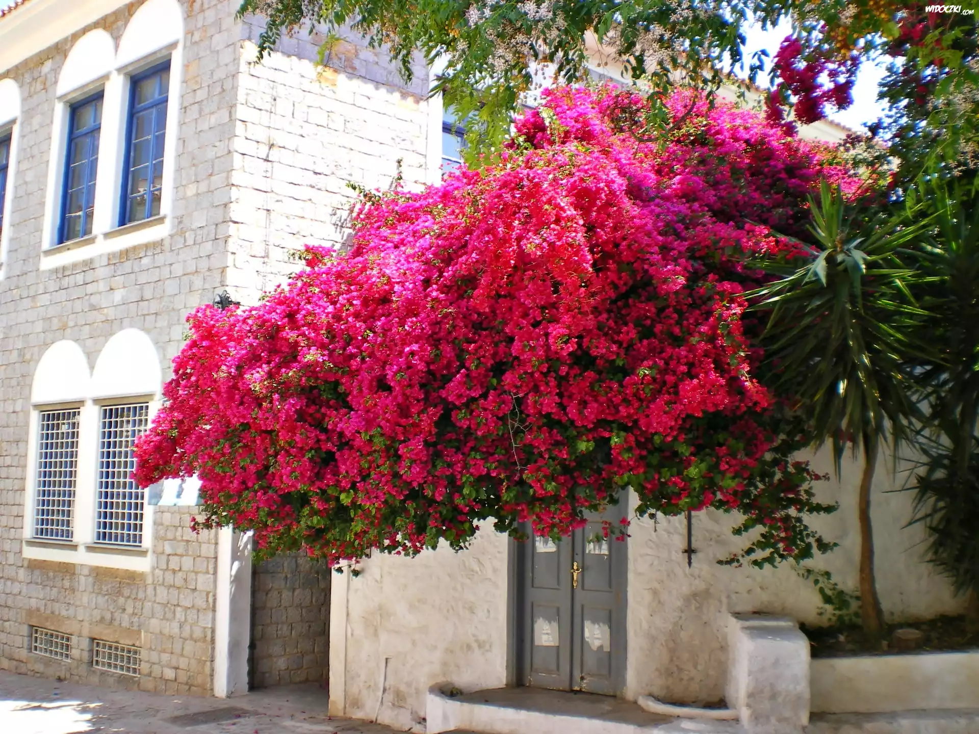 Rozświetlony, Dom, Ogród, Kwitnąca, Bugenwilla