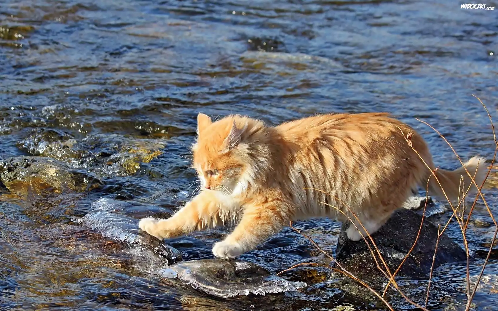 Zdjęcia, Rudy, Kot, Rzeka, Kamienie