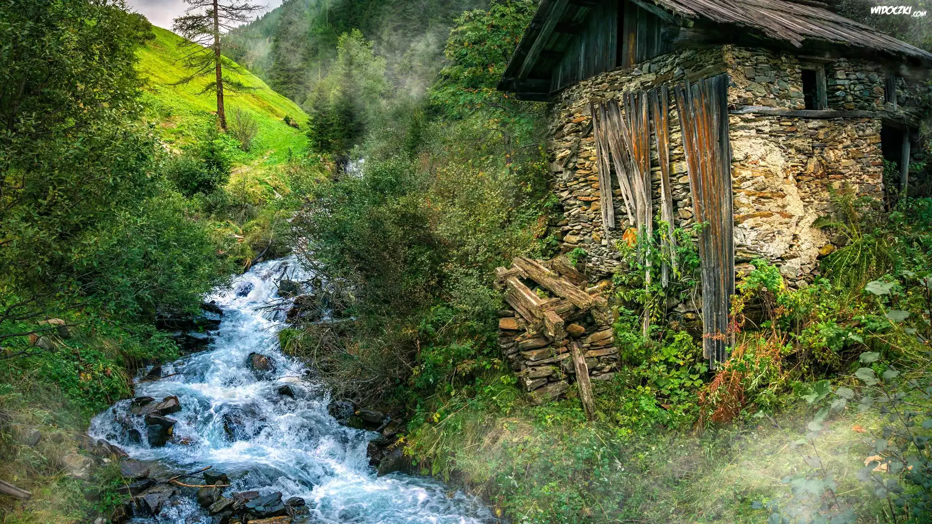 Zdjęcia, Ruina, Kamienny, Dom, Potok, Drzewa, Góry