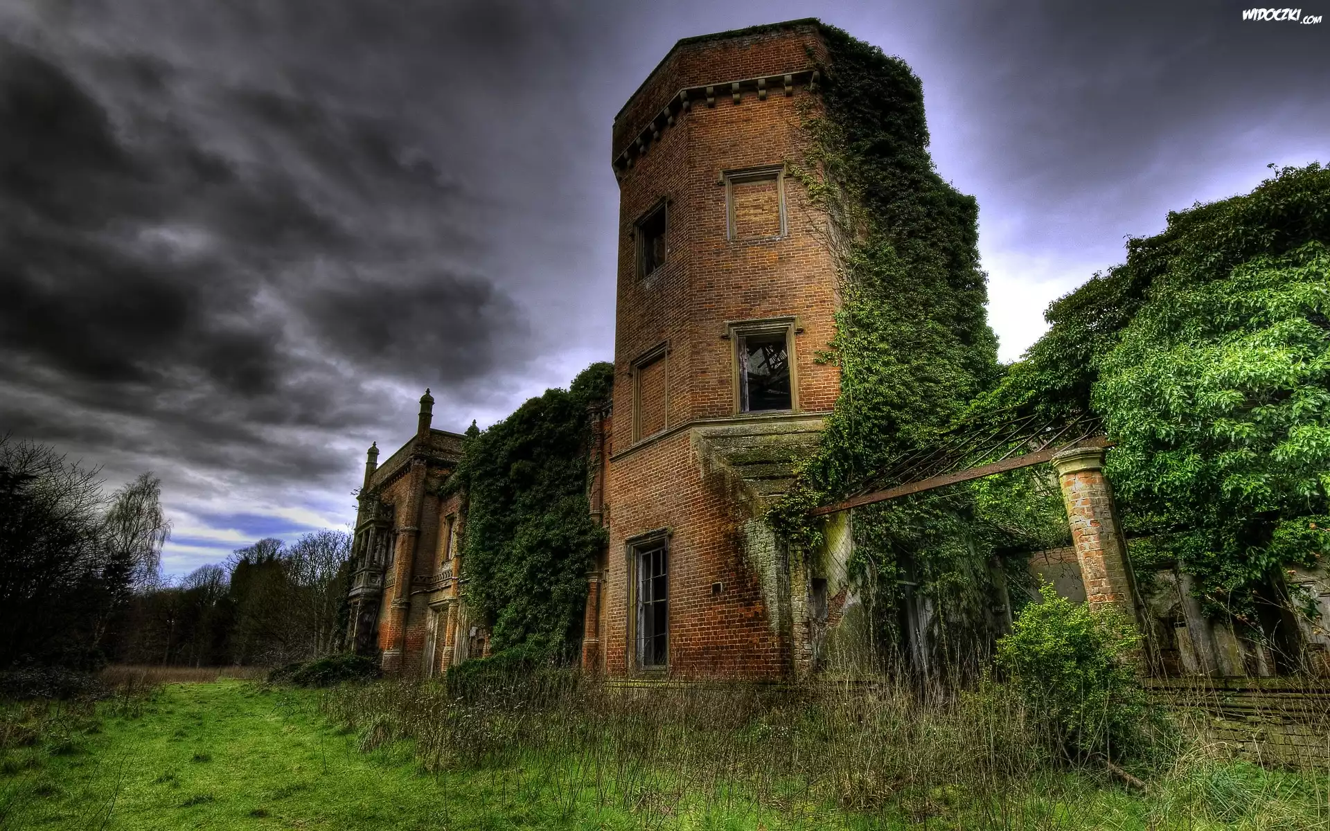 Zdjęcia, Ruiny, Pokryte, Roślinami, Burzowe, Chmury