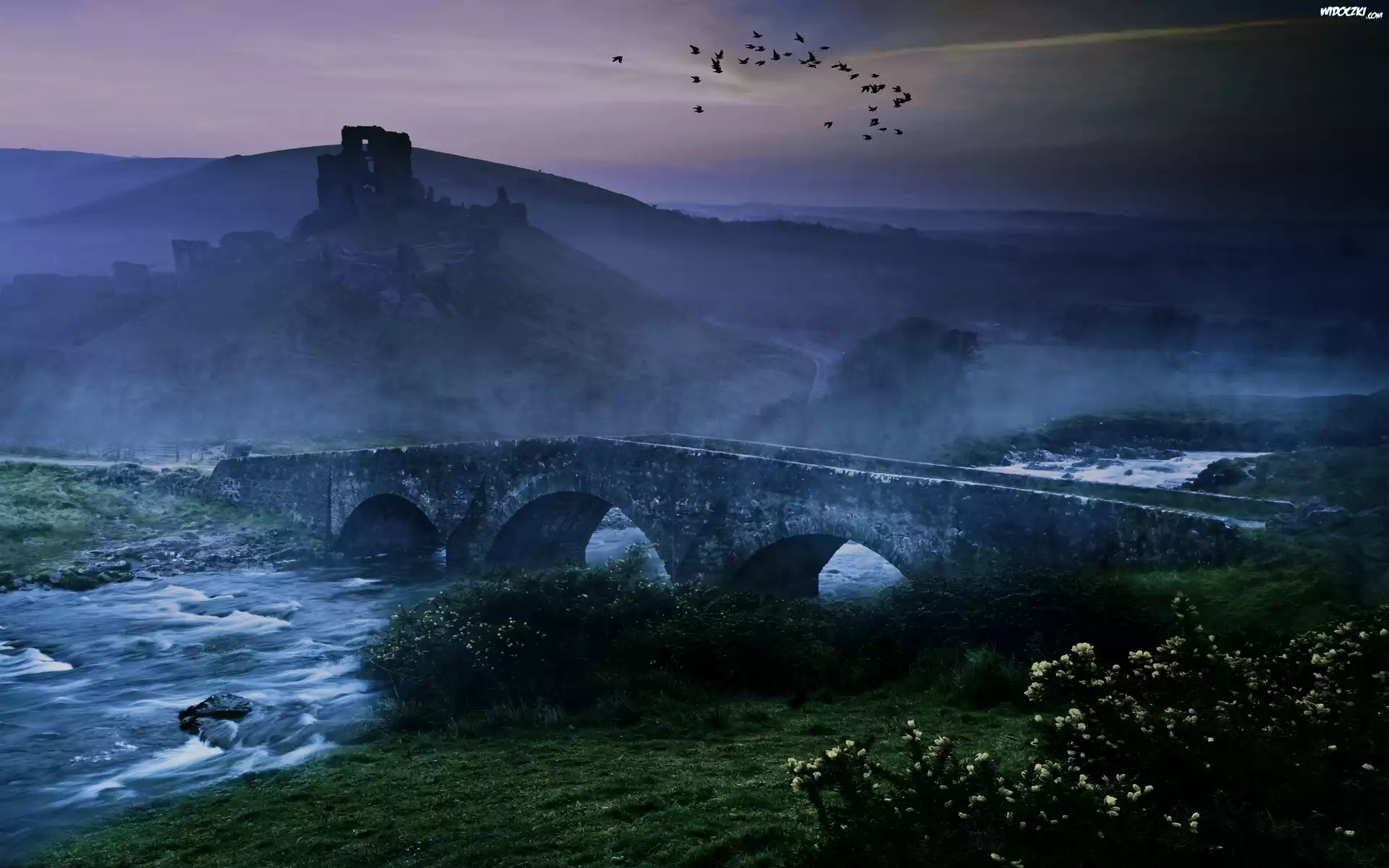 Ruiny, Most, Rzeka, Mgła, Ptaki, Rośliny