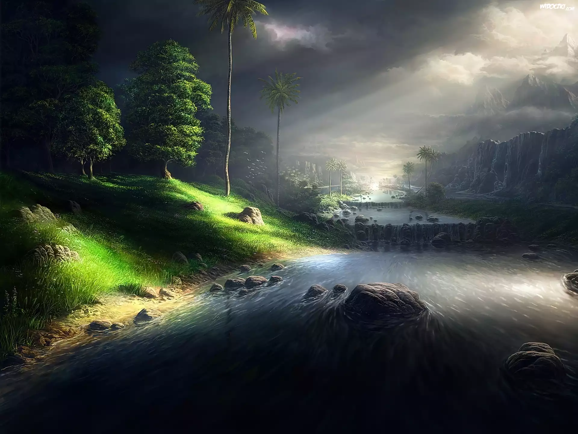 Przyroda, Las, Drzewa, Promienie, Słońca Góra, Skały Zielone, Liście, Przebijające, Światło Woda, Kamienie, Las Przebijające Światło, Chmury Drzewa, Rzeka Morze, Skały Rwąca, Rzeka, Kaskady, Krajobraz Las, Przebijające, Słońce Góry, Lasy, Rzeka Jaskinia, Światło Góra, Rzeki Fale, Przebijające Światło Zatoka, Szlak, Morze, Skały
