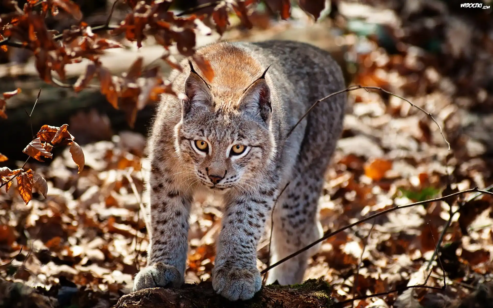 Zdjęcia, Ryś, Las, Liście, Jesień