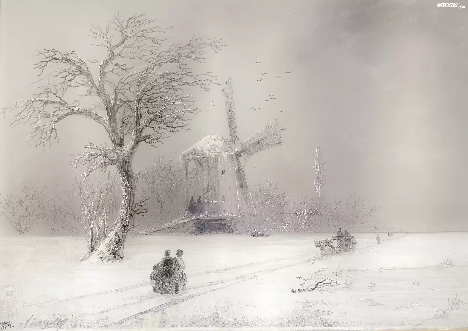 Zdjęcia, Rysunek, Zima, Śnieg, Zaprzęg, Wiatrak