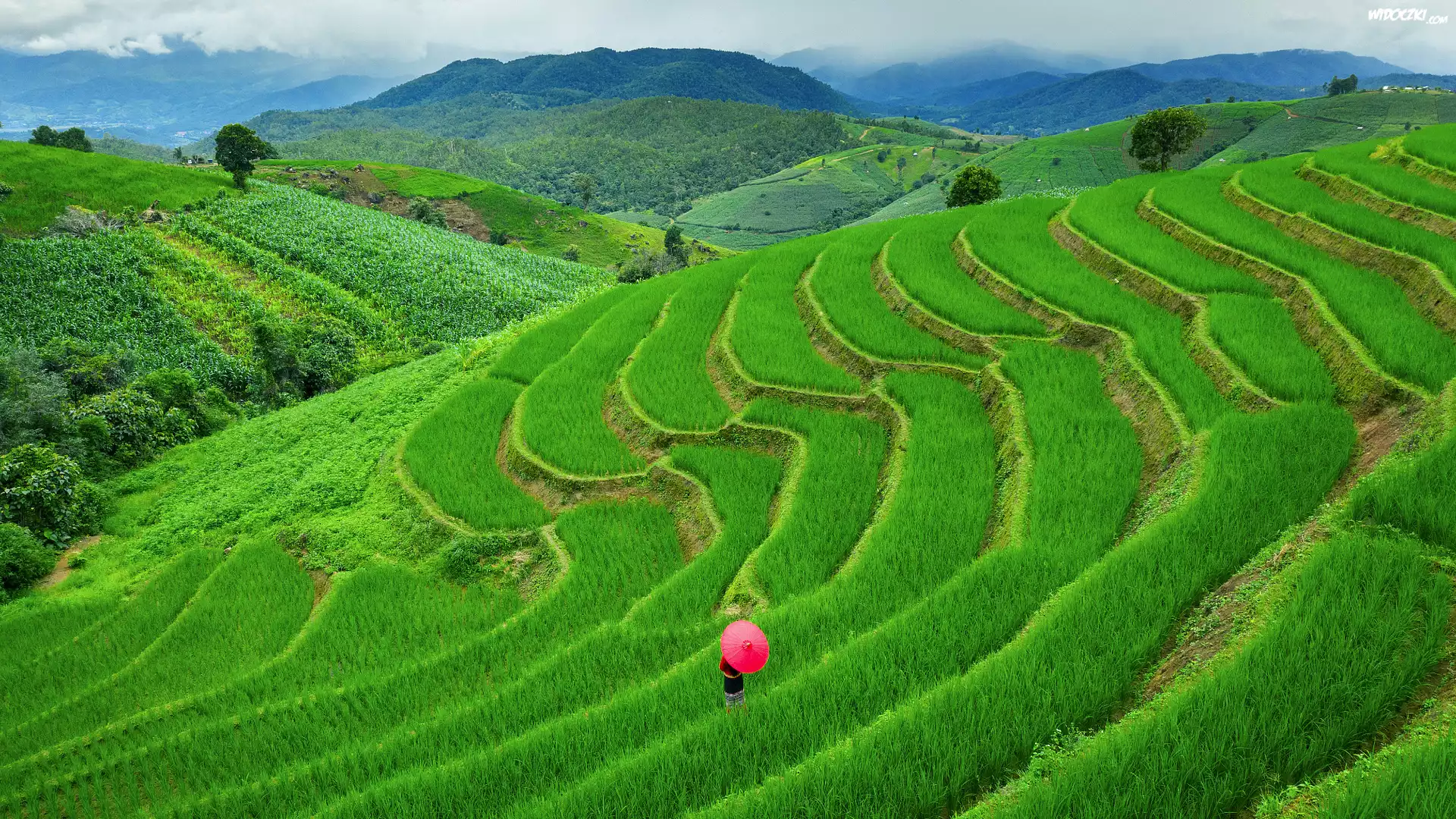Kobieta, Parasolka, Pola, Tarasy ryżowe, Góry, Wzgórza, Drzewa, Pa Bong Piang, Chiang Mai, Tajlandia |
