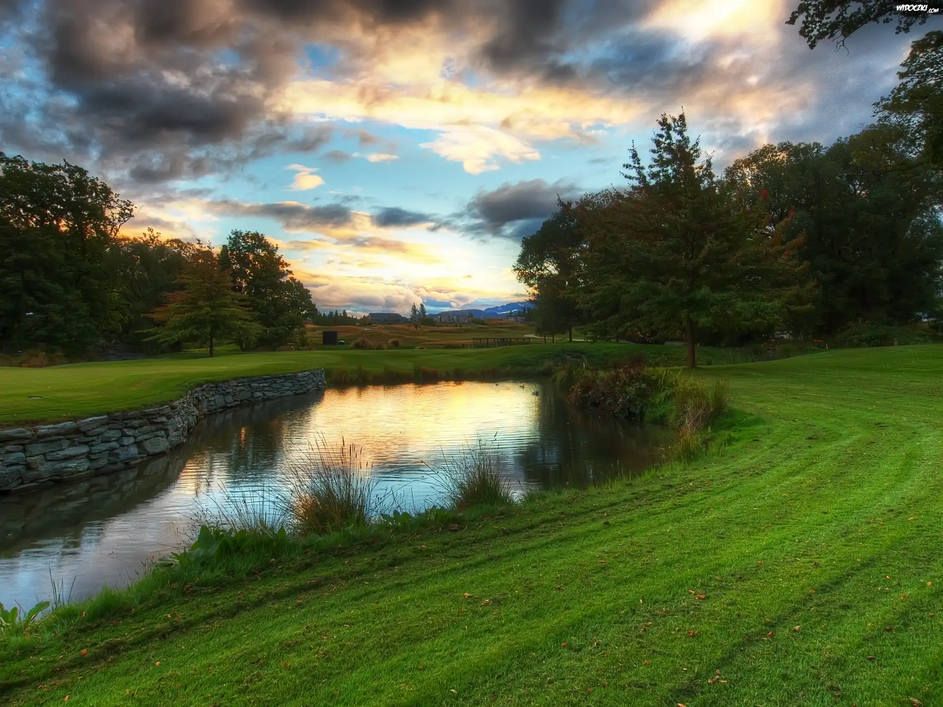 Zdjęcia, Rzeczka, Trawa, Drzewa, Chmury