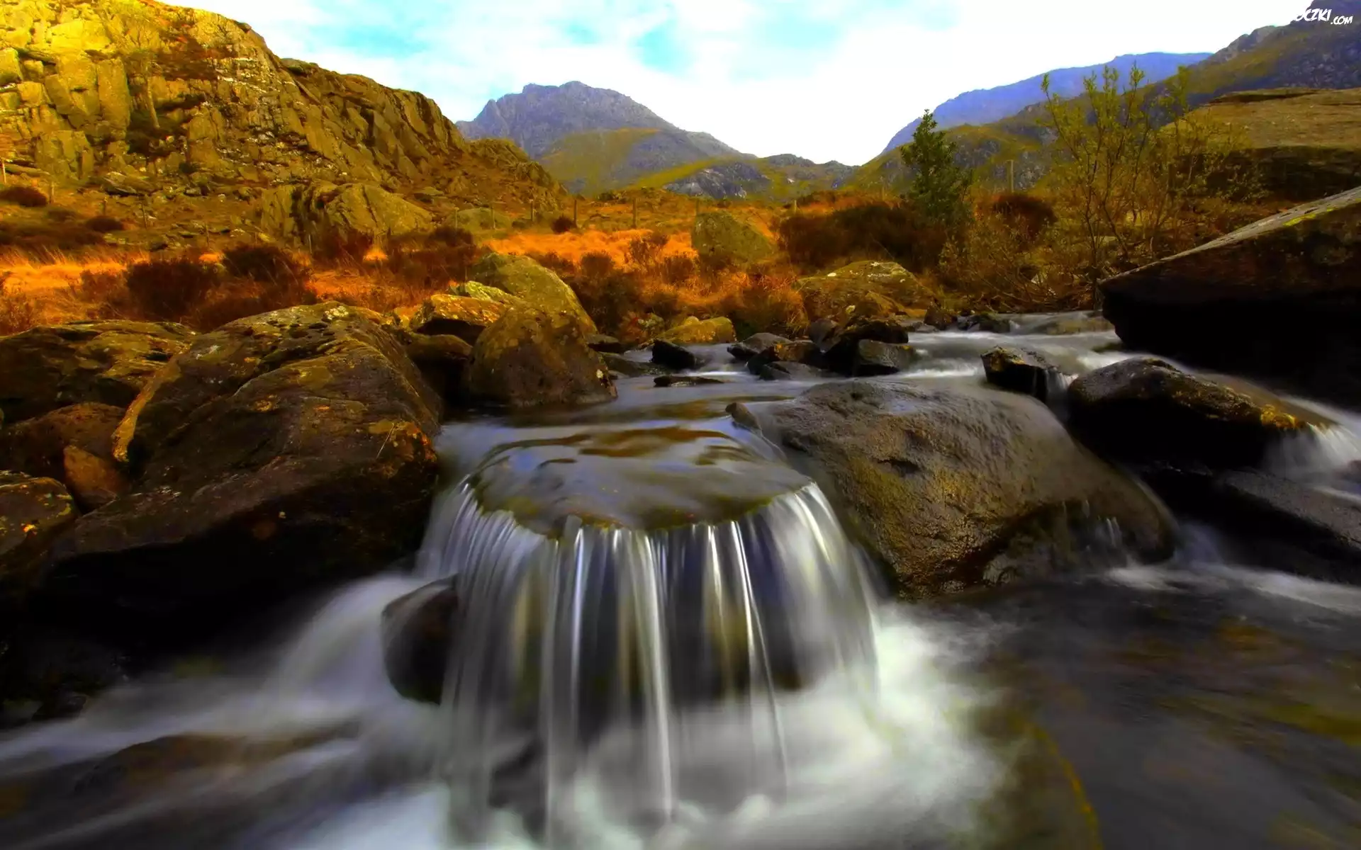 Zdjęcia, Rzeczka, Wodospad, Krzewy, Góry, Kamienie