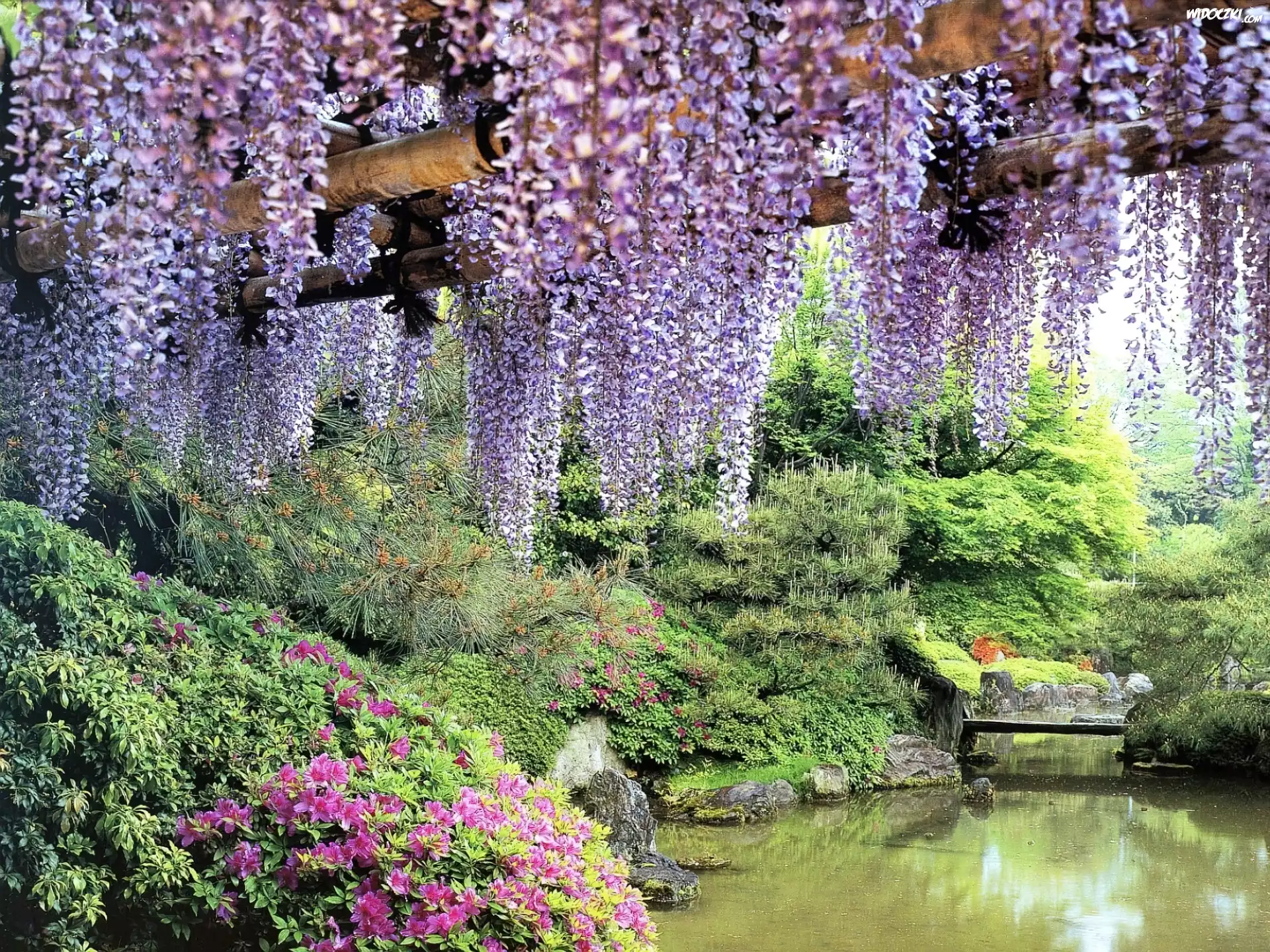 Zdjęcia, Rzeczka, W, Parku, Kwitnąca, Glicynia