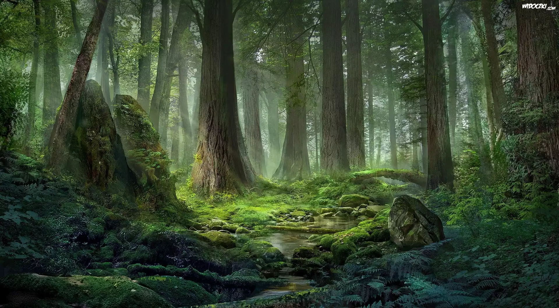 Las, Rzeczka, Paprocie, Kamienie, Mech, Promienie, Słońca
