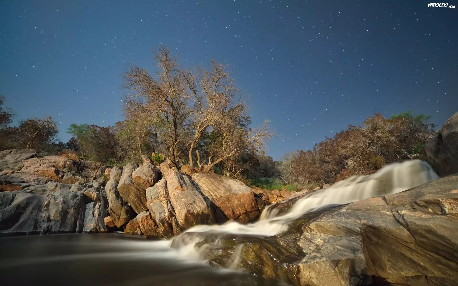 Zdjęcia, Rzeczka, Skały, Drzewa, Rozgwieżdżone, Niebo
