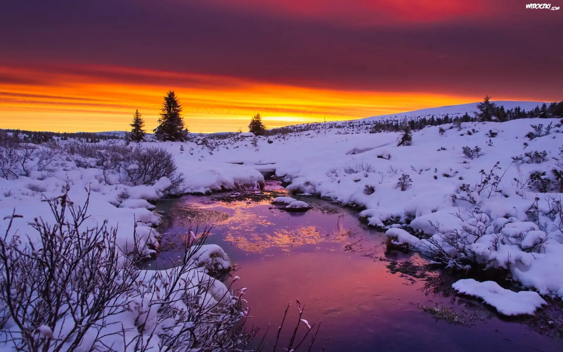 Zdjęcia, Rzeczka, Góry, Drzewa, Zachód, Słońca, Zima