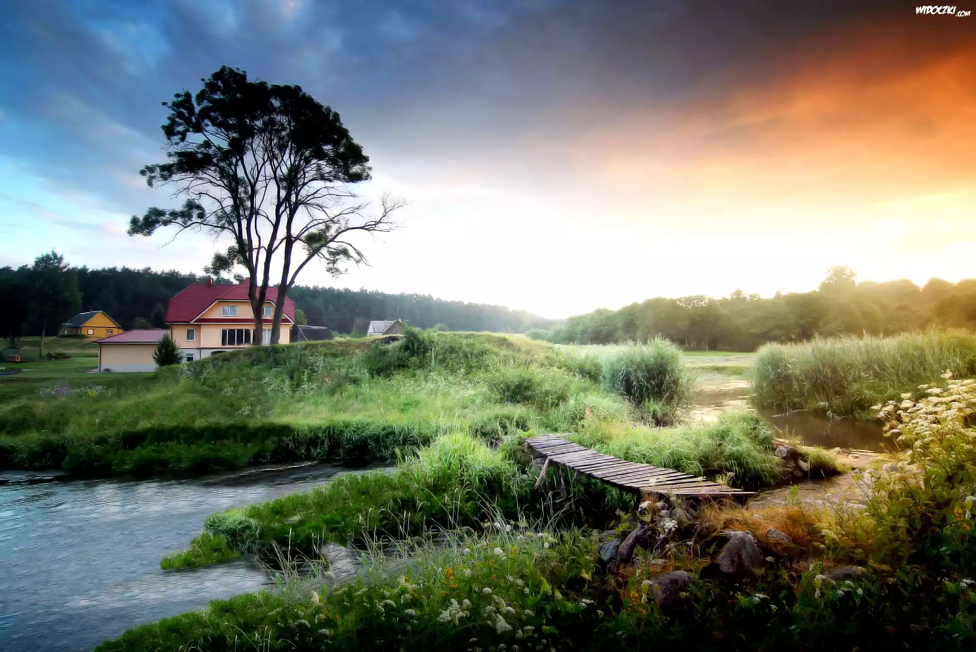 Zdjęcia, Rzeczka, Kładka, Dom, Trawy, Drzewa