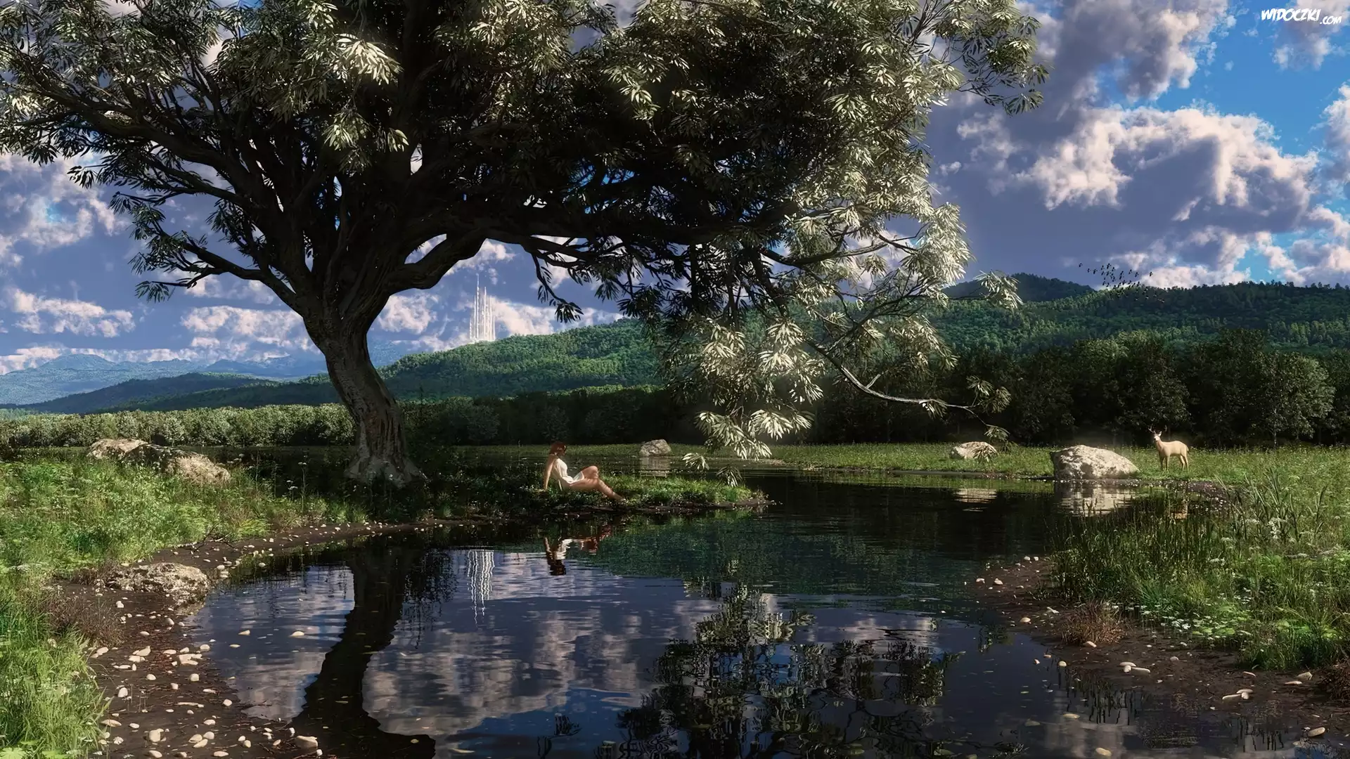 Rzeczka, Drzewo, Zieleń, Kobieta