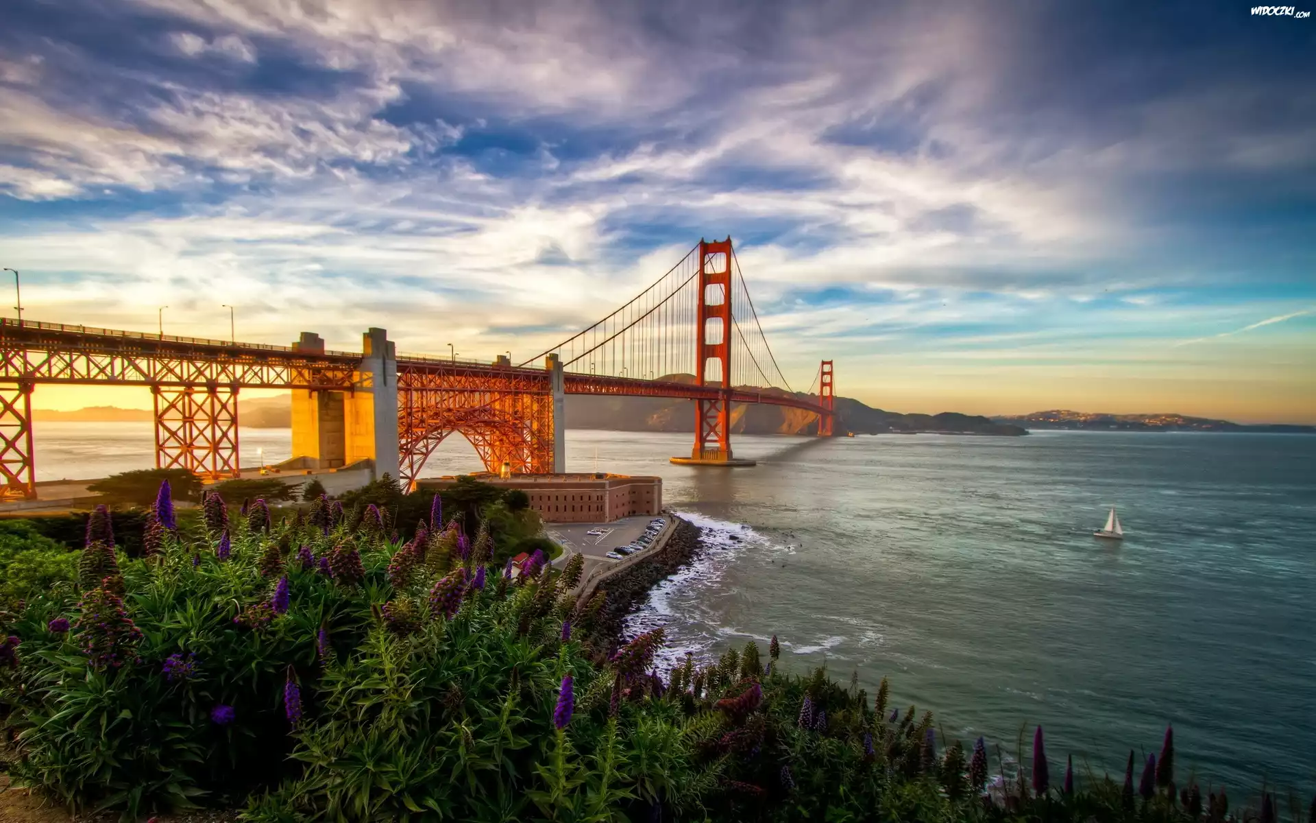 Zdjęcia, Rzeka, Most, Żaglówka, Kwiaty