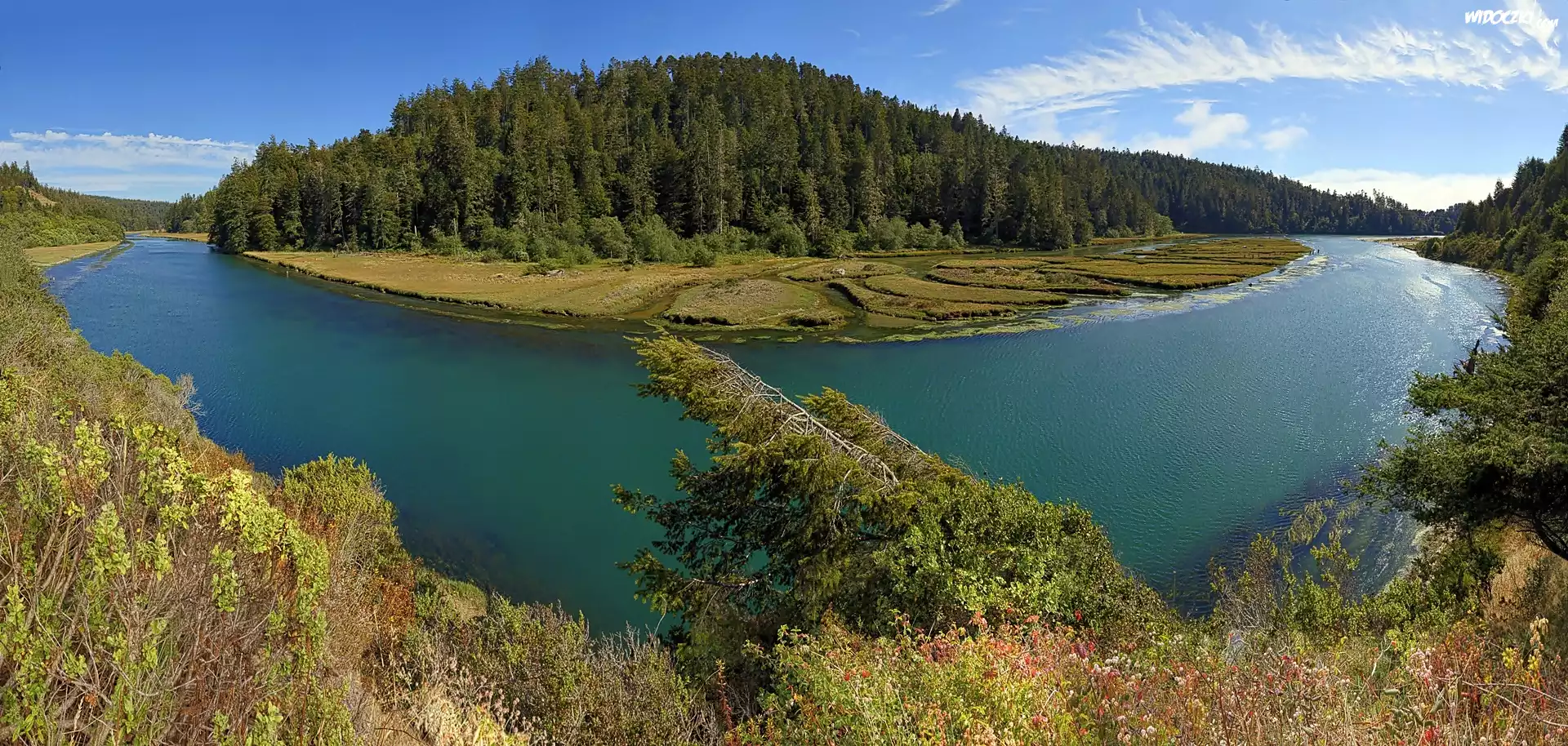 Zdjęcia, Rzeka, Las, Łąka, Obłoki
