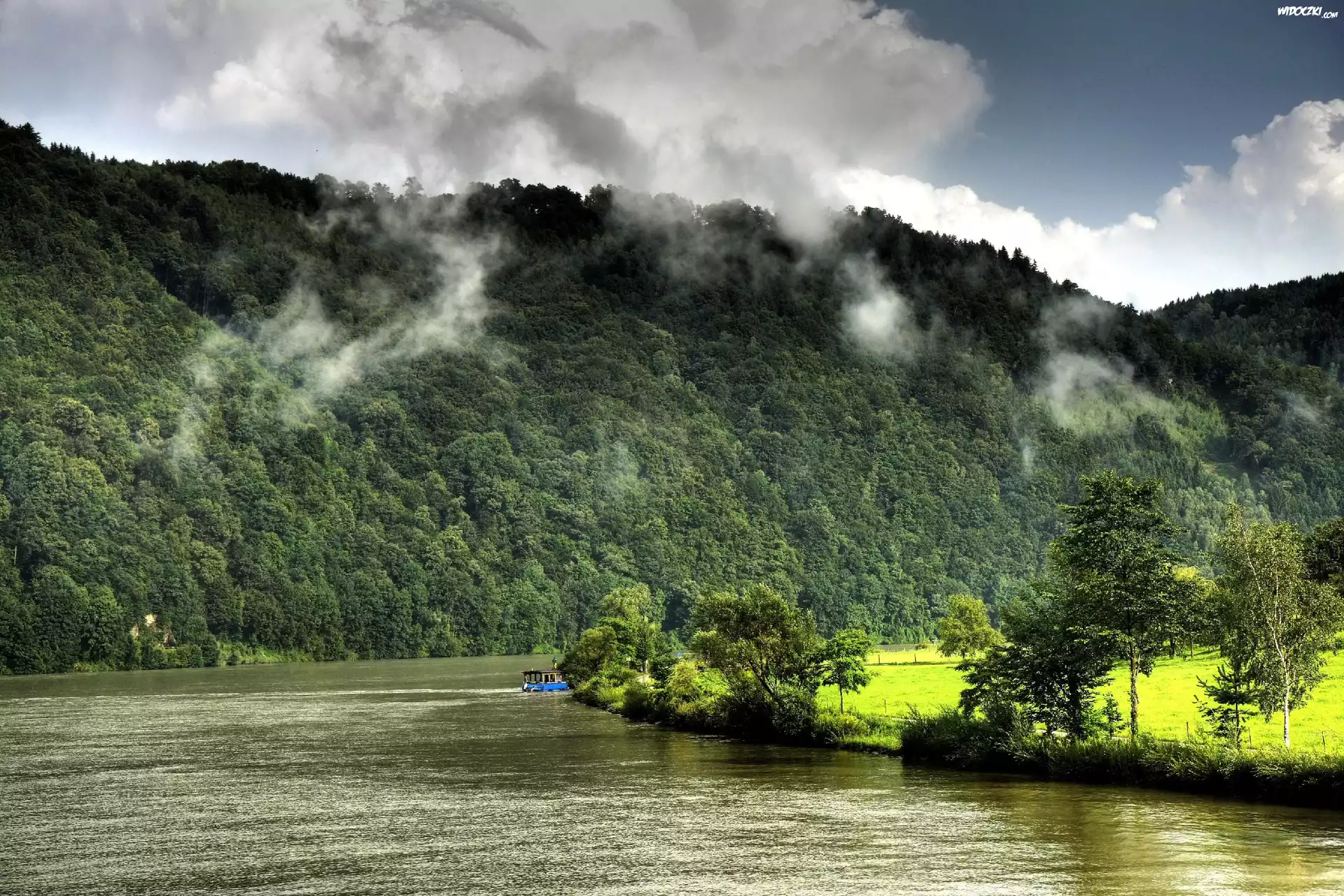 Zdjęcia, Rzeka, Góry, Lasy, Łąka, Chmury