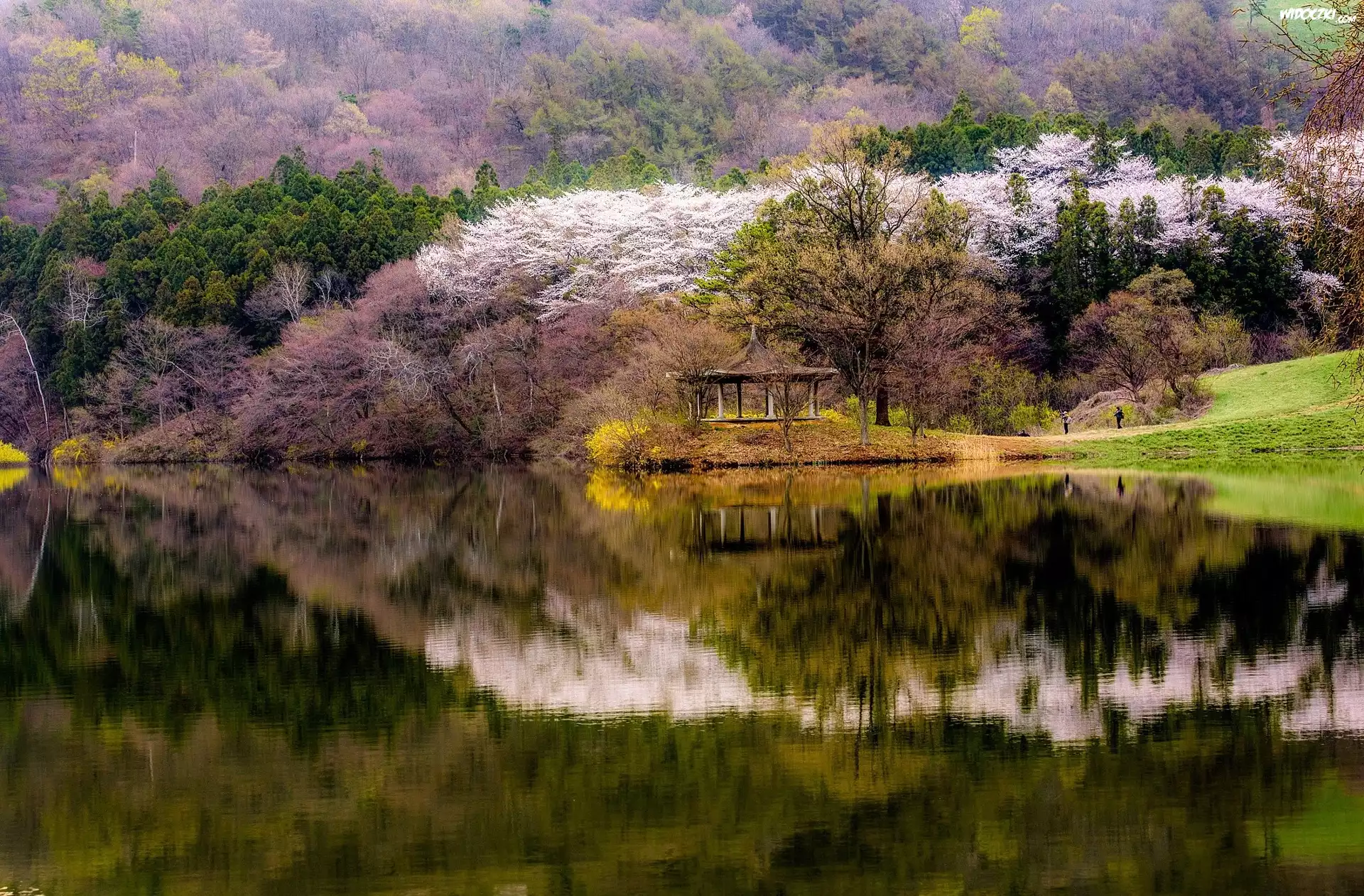 Zdjęcia, Rzeka, Drzewa, Altanka, Odbicie