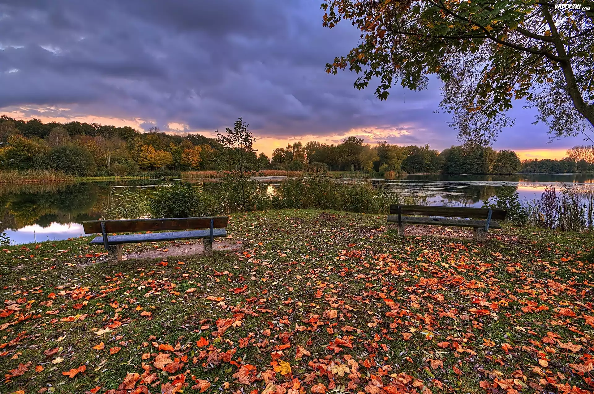Zdjęcia, Rzeka, Liście, Zachód Słońca, Ławki, Drzewa