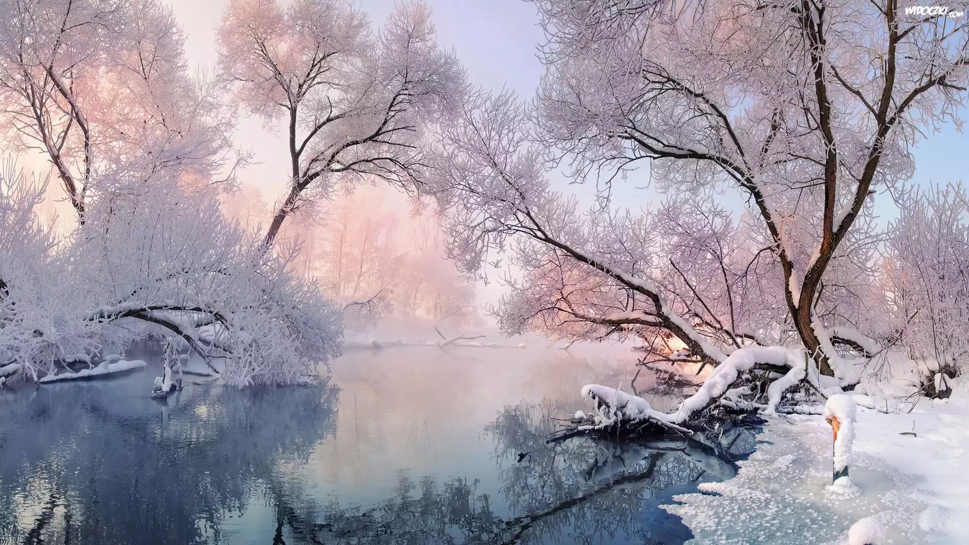 Zima, Rzeka Świsłocz, Ośnieżone, Drzewa, Krzewy, Mgła, Białoruś