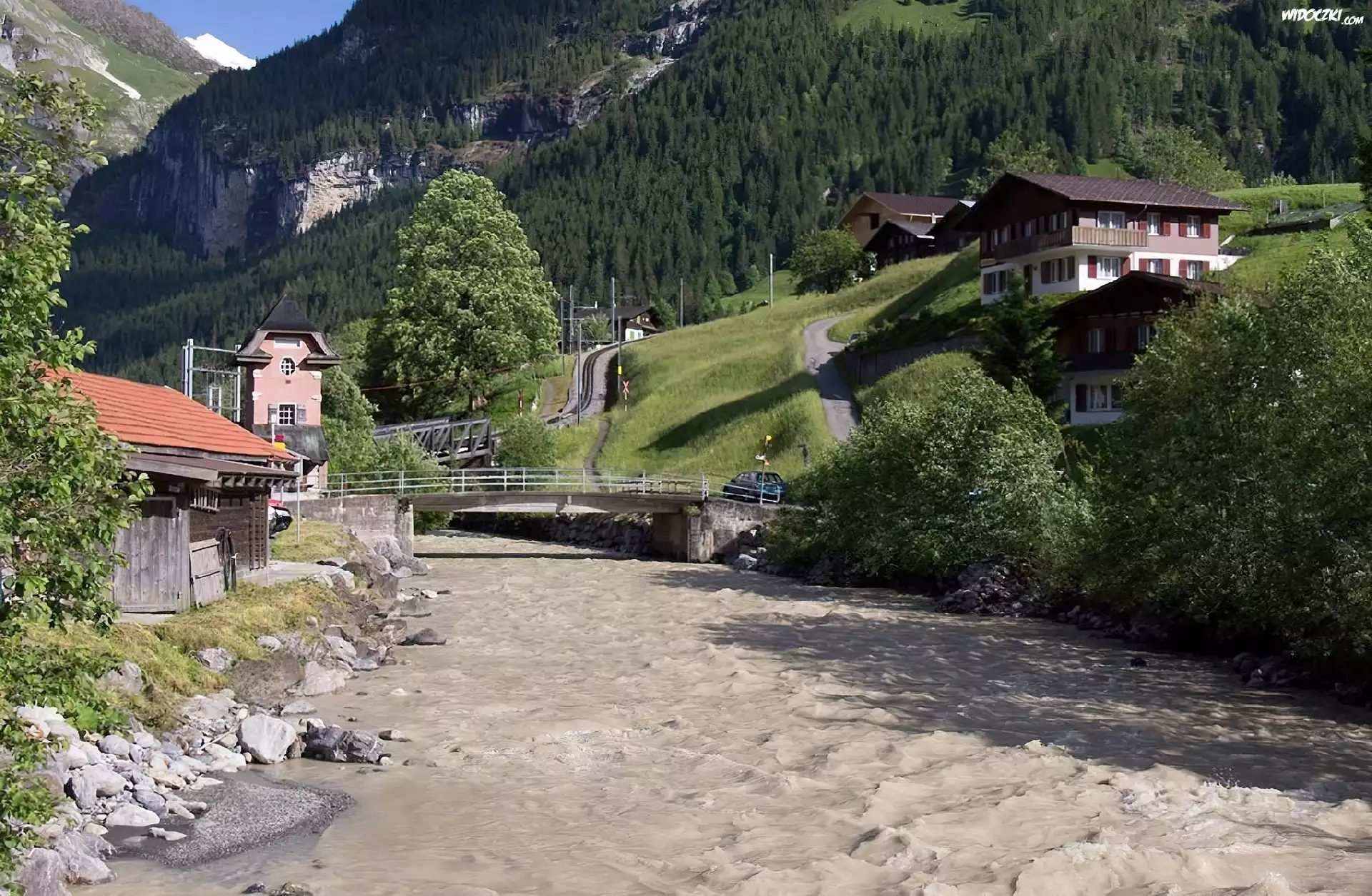 Zdjęcia, Rzeka, Most, Budynki, Góry