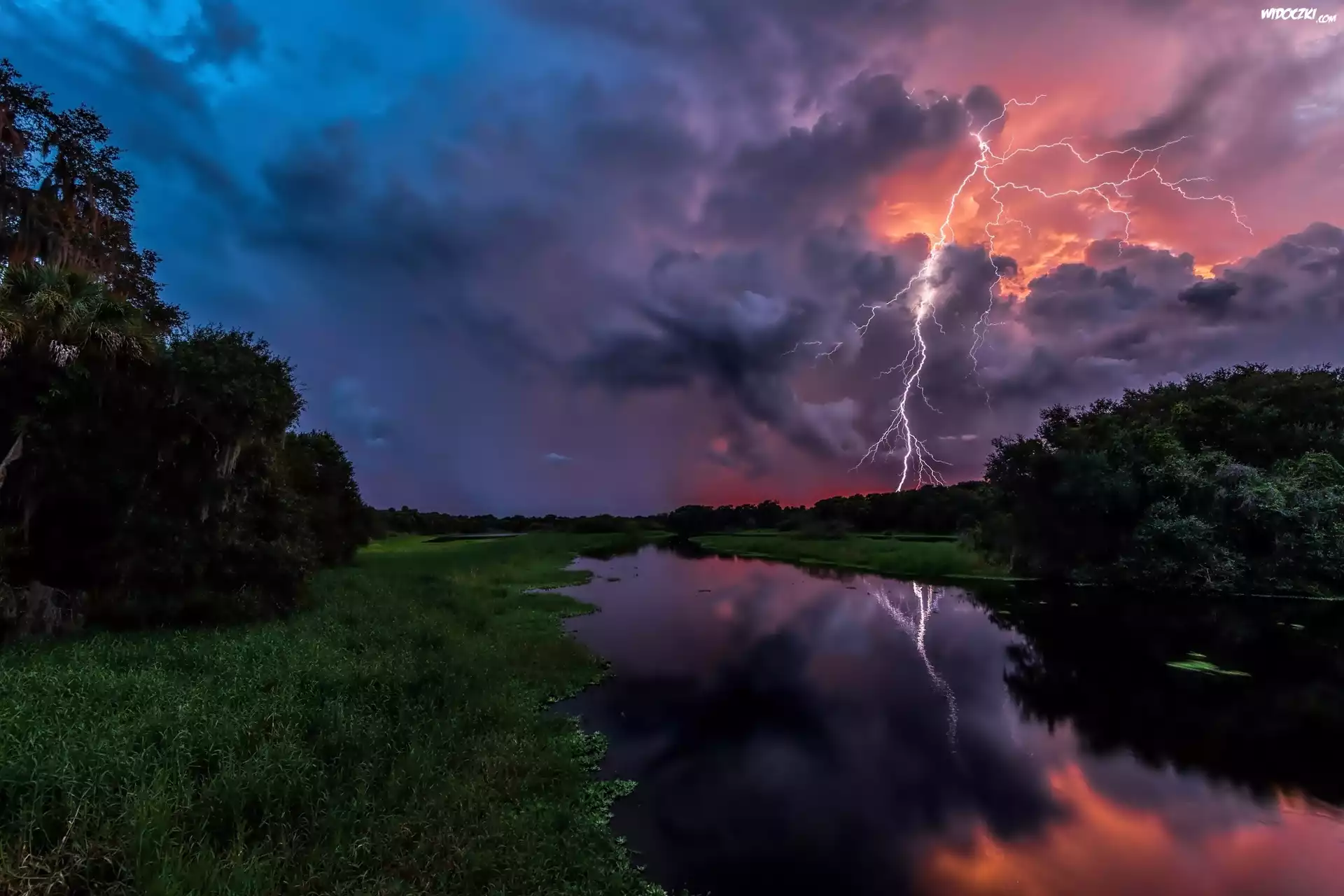 Zdjęcia, Rzeka, Chmury, Burza, Błyskawice