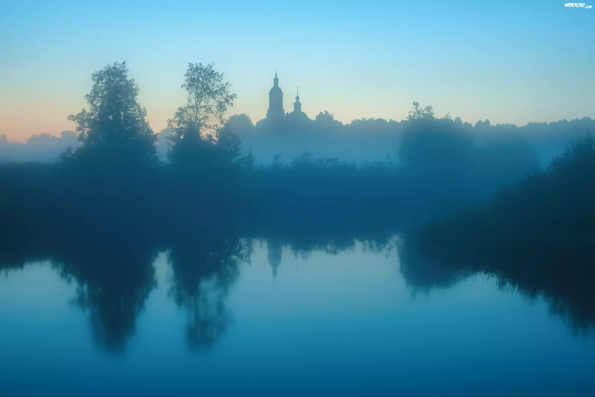 Zdjęcia, Rzeka, Mgła, Cerkiew, Drzewa