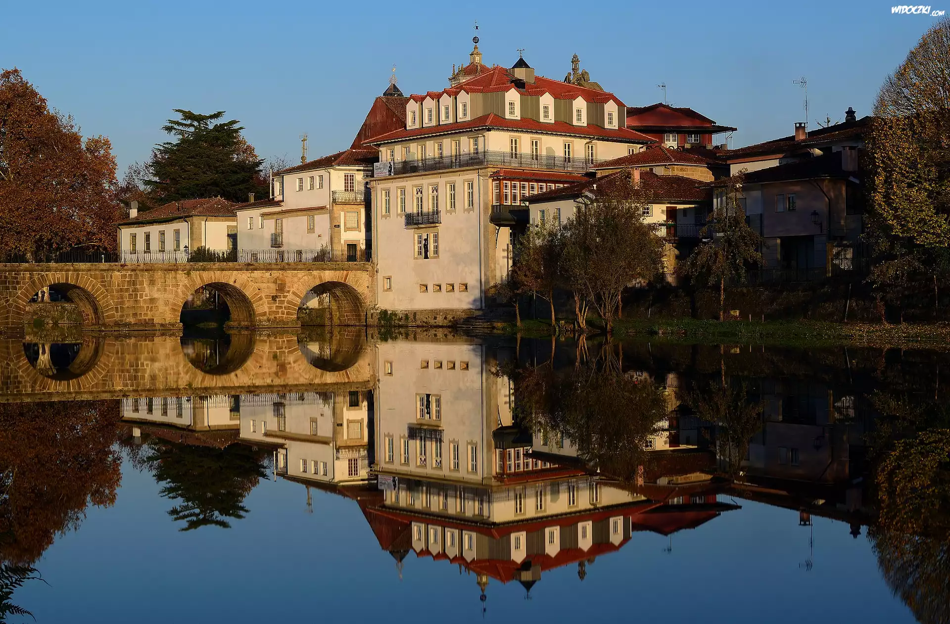Zdjęcia, Rzeka Tamega, Most, Trajano Bridge, Domy, Drzewa, Odbicie, Chaves, Portugalia