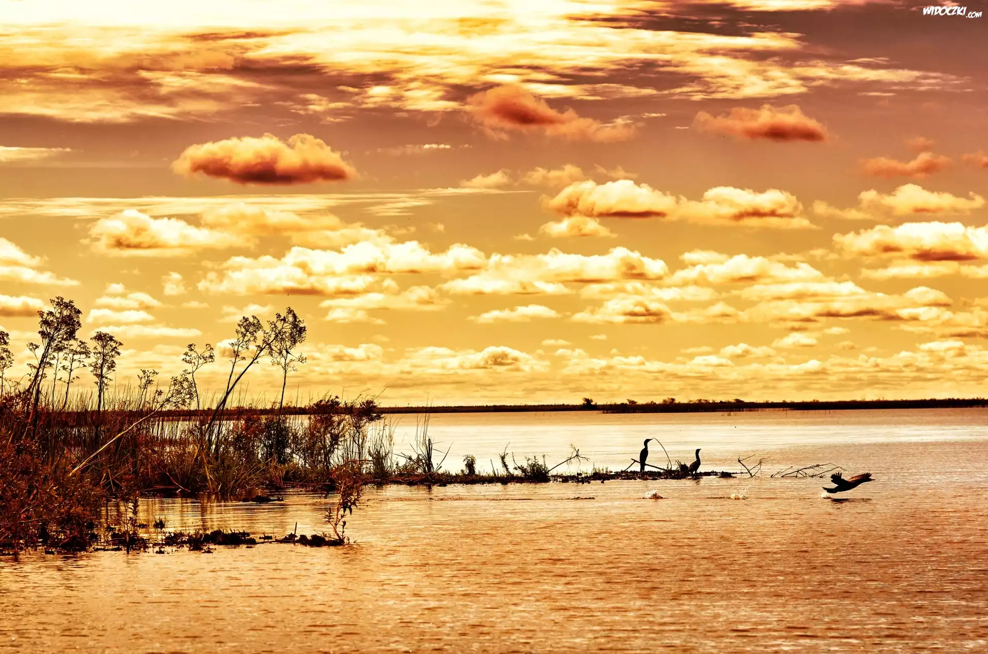Argentyna, Rzeka, Rośliny, Ptaki, Zachód, Słońca, Niebo, Chmury
