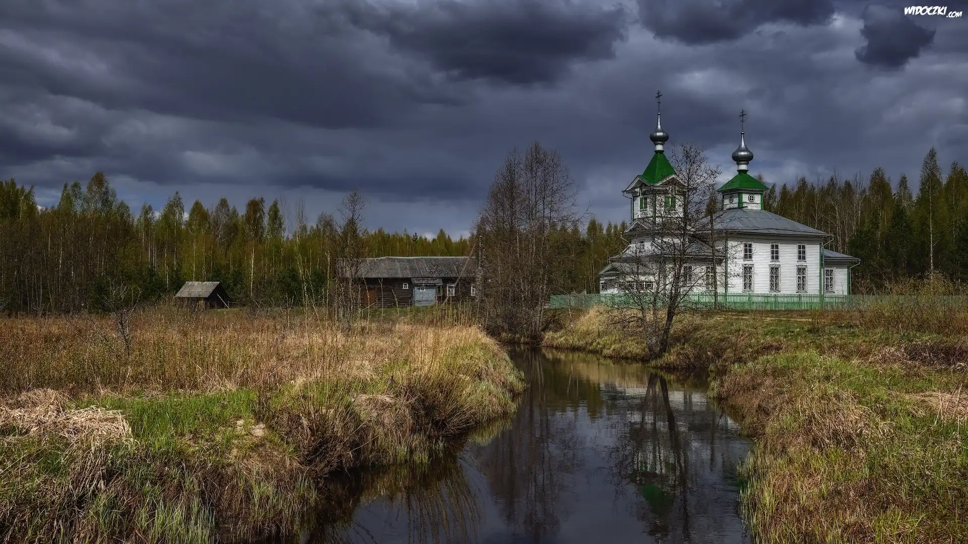 Cerkiew, Rzeka, Chmury, Łąka, Drzewa