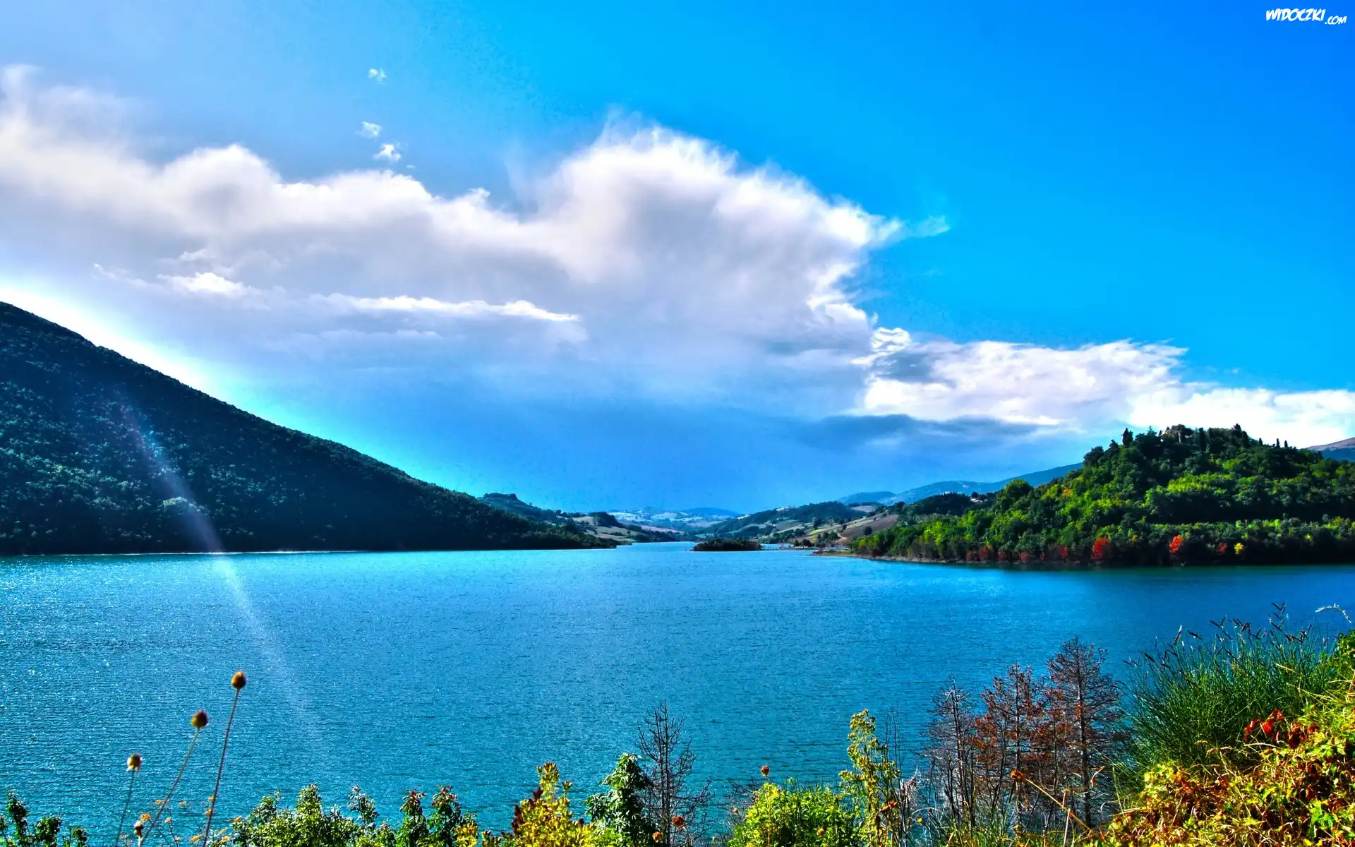 Zdjęcia, Rzeka, Wysepka, Góry, Lasy, Chmury, Promienie