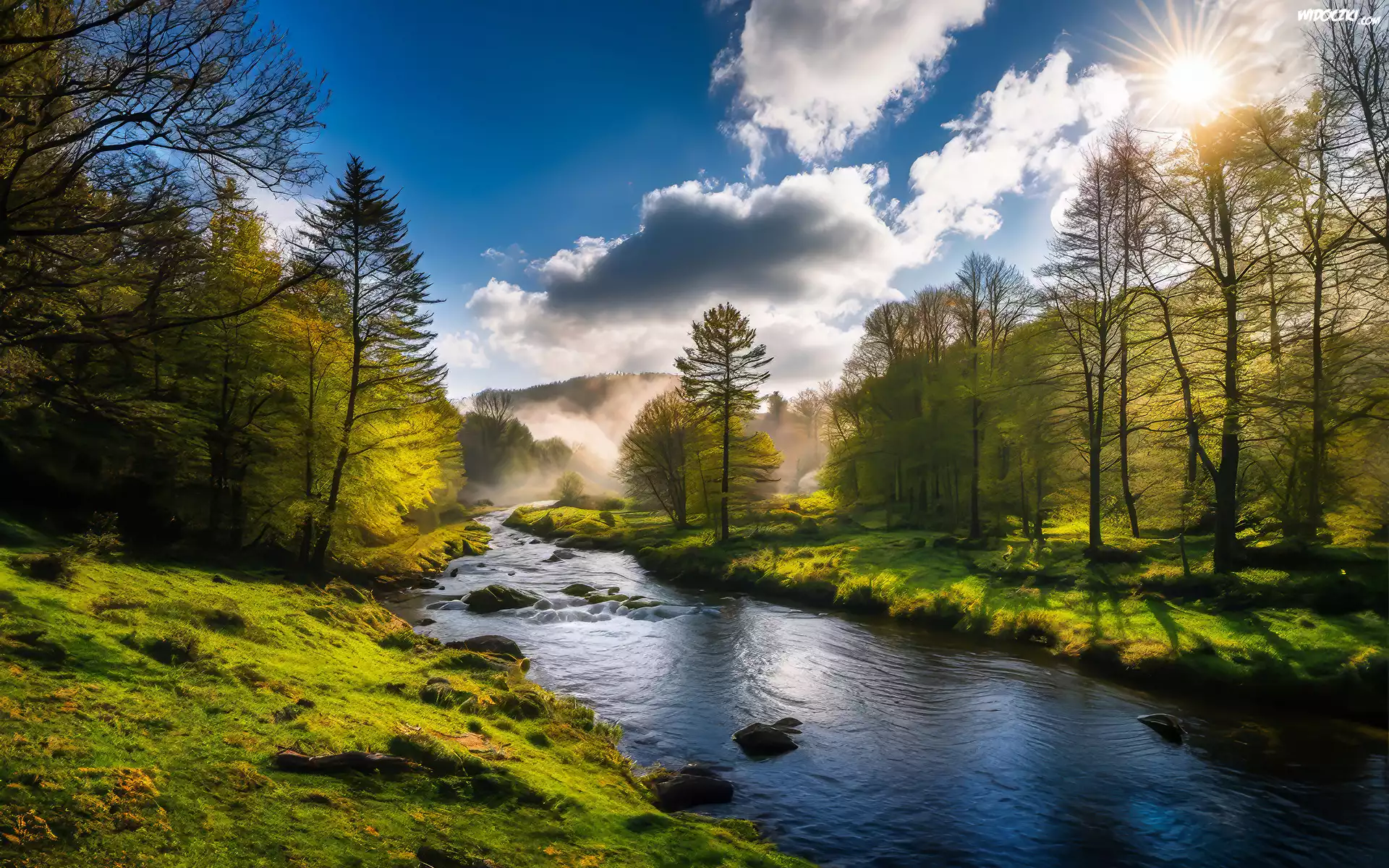 Poranek, Mgła, Chmury, Rzeka, Kamienie, Drzewa, Trawa
