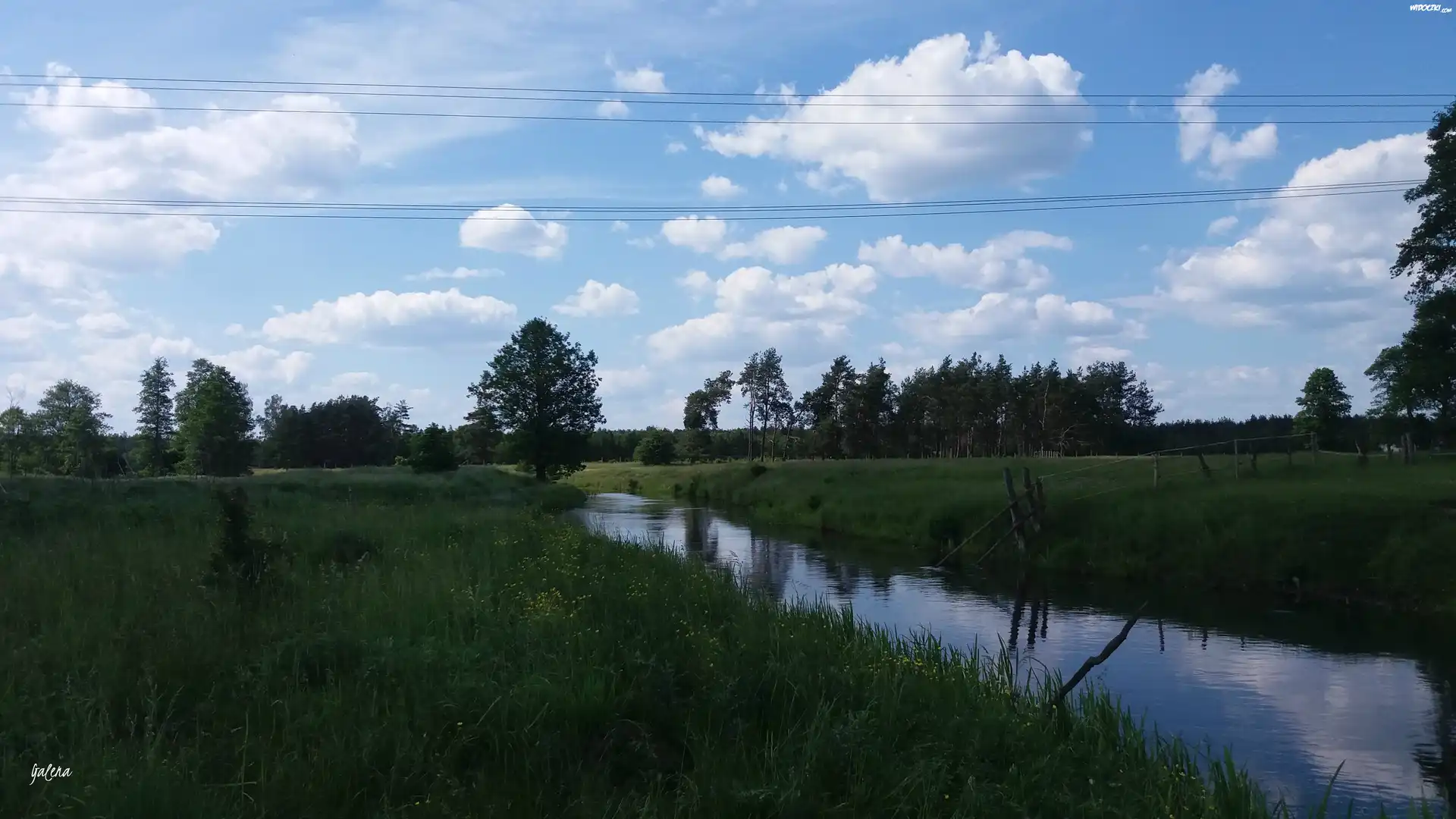 Rzeka, Drzewa, Niebo, Chmury, Łąka
