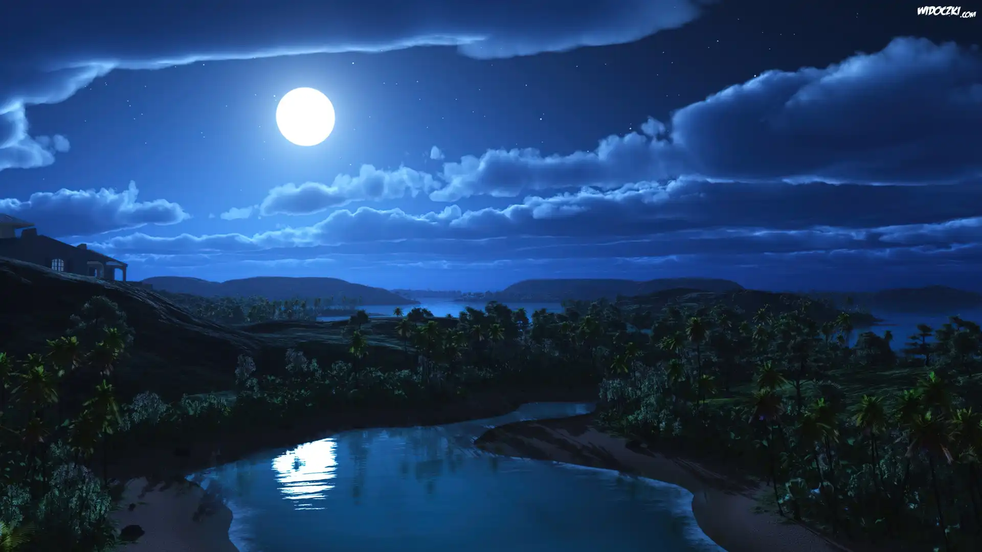 Zdjęcia, Rzeka, Noc, Chmury, Księżyc