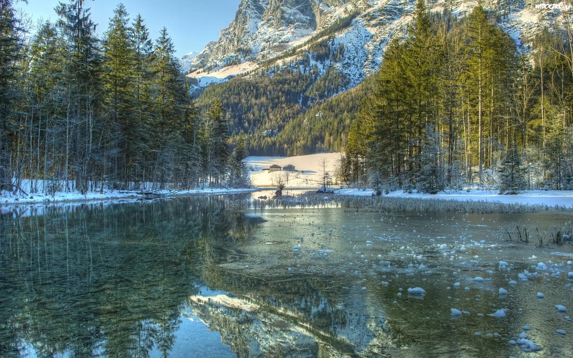 Zdjęcia, Rzeka, Góry, Choinki, Zima