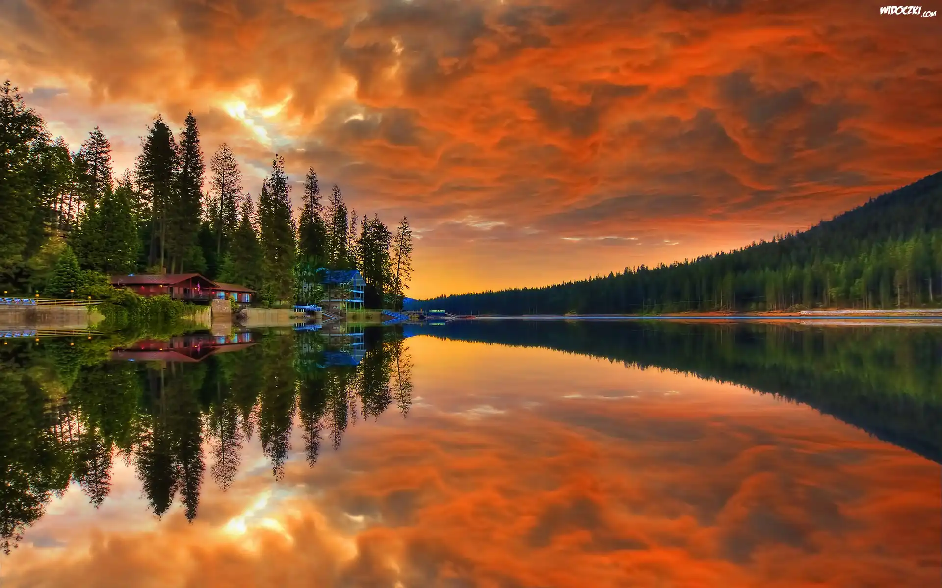 Zdjęcia, Rzeka, Lasy, Domy, Wczasowe, Ciemne, Chmury