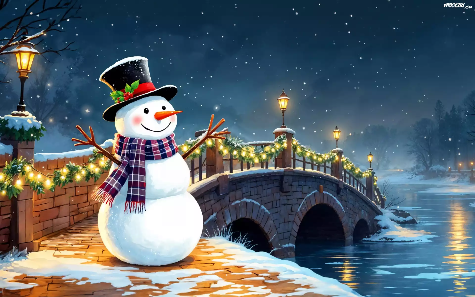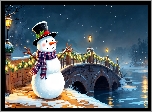Zima, Bałwan, Cylinder, Szalik, Most, Lampy, Śnieg, Rzeka
