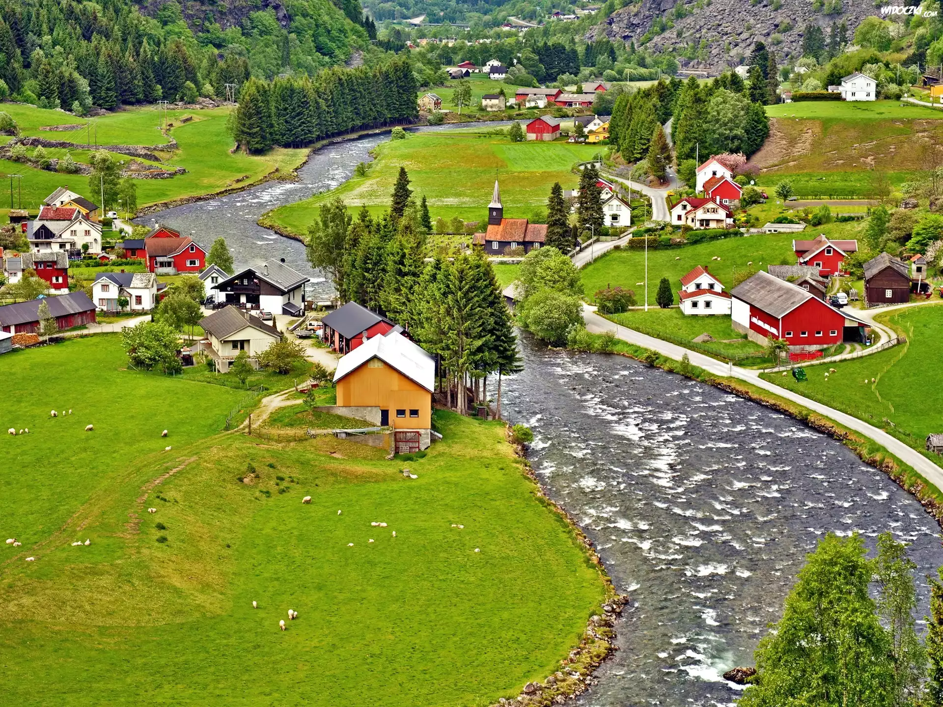 Rzeka, Łąki, Domy, Norwegia