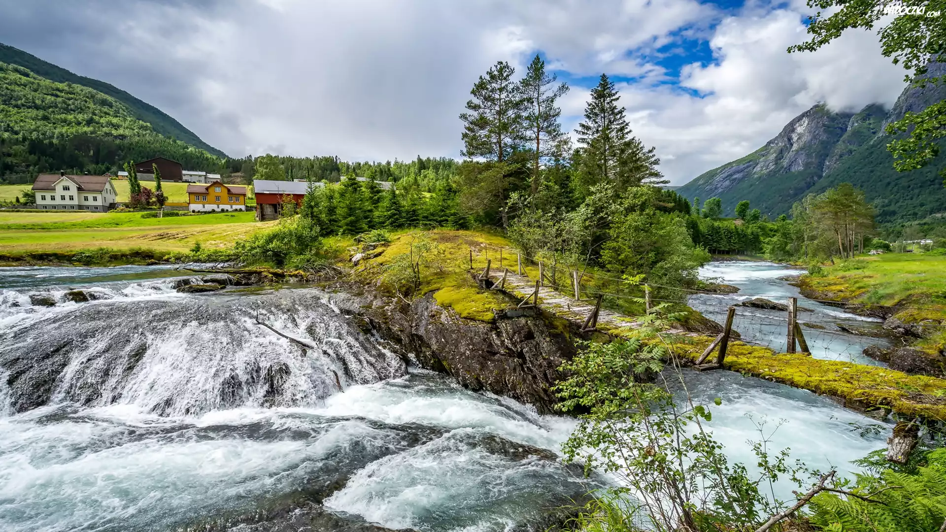 Zdjęcia, Rzeka, Kładka, Góry, Domy, Drzewa