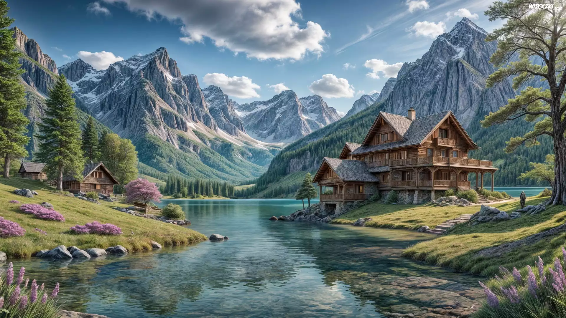 Zdjęcia, Góry, Rzeka, Domy, Drzewa, Grafika