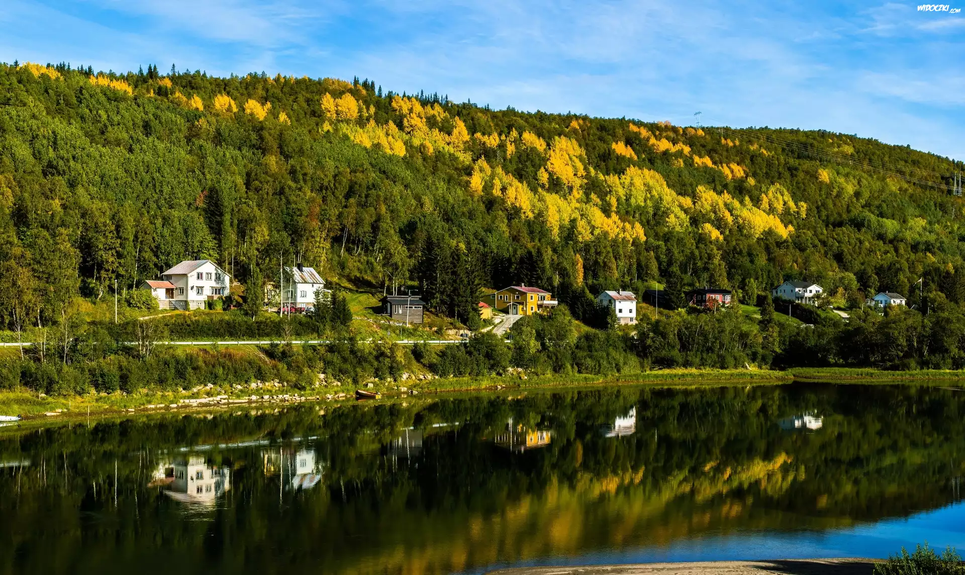 Zdjęcia, Rzeka, Góry, Lasy, Domy, Jesień