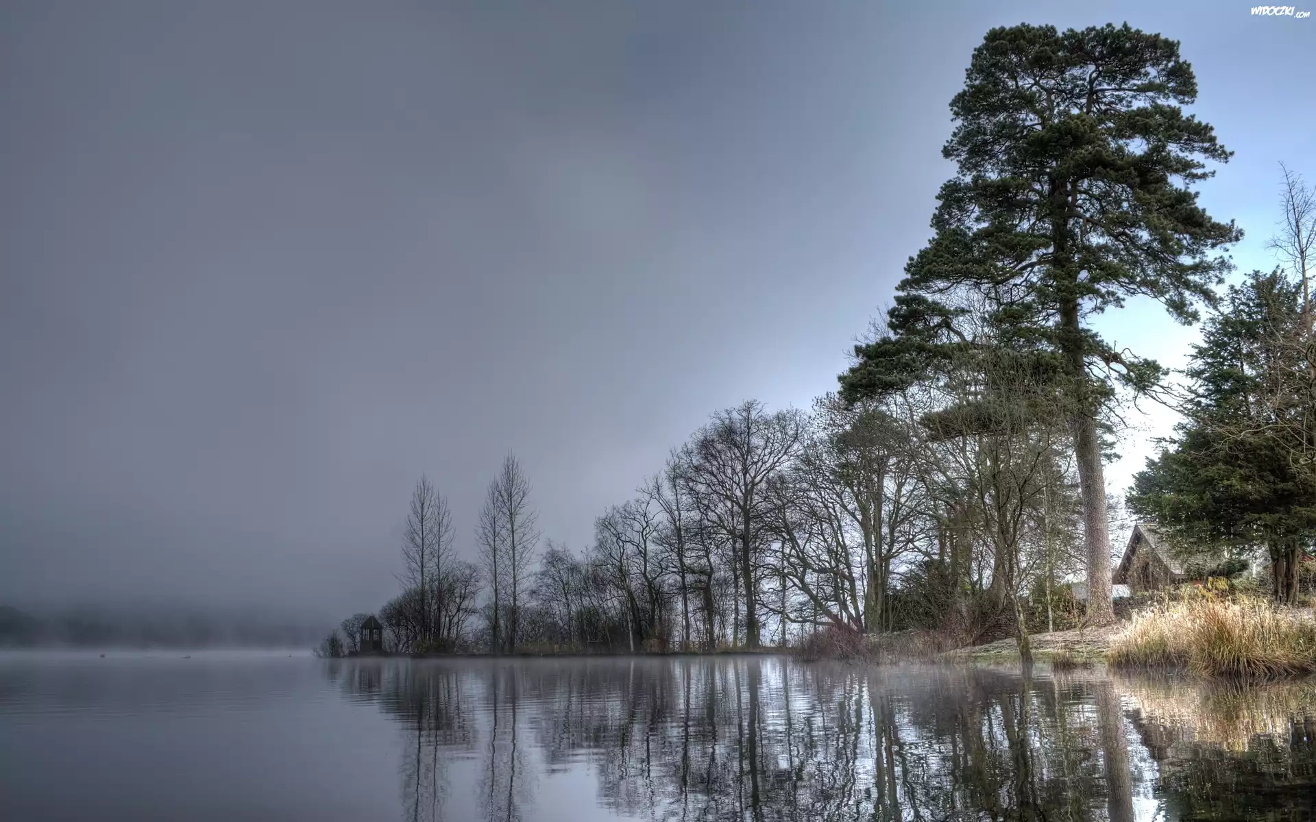 Zdjęcia, Rzeka, Drzewa, Mgła, Domy, Zima