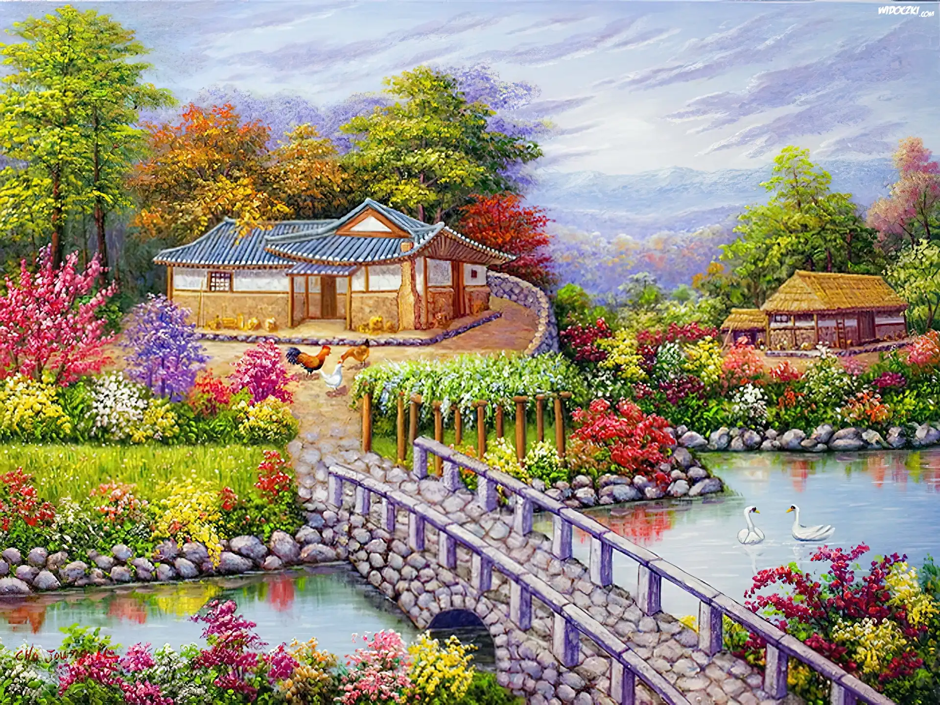 Rzeka, Most, Domy, Ogrody
